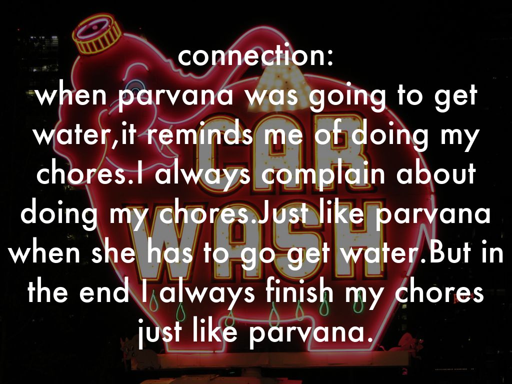 when parvana was going to get water,it reminds me of doing my chores.I always complain about doing my chores.Just like parvana when she has to go get water.But in the end I always finish my chores just like parvana.