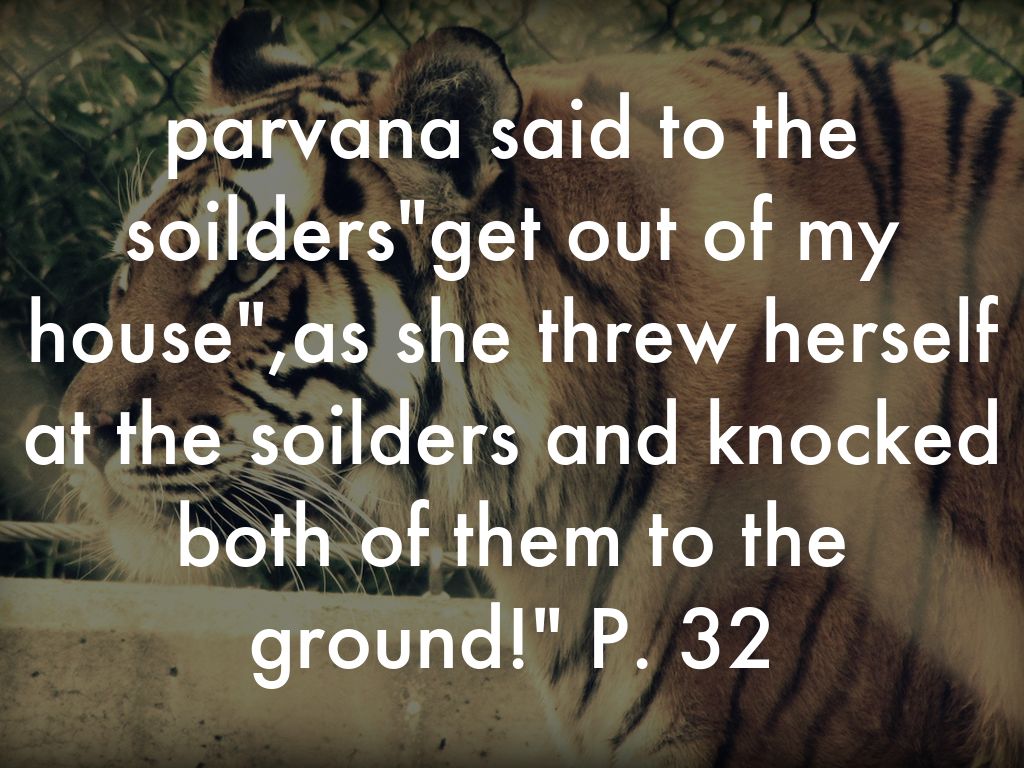 parvana said to the soilders"get out of my house",as she threw herself at the soilders and knocked both of them to the ground!" P. 32