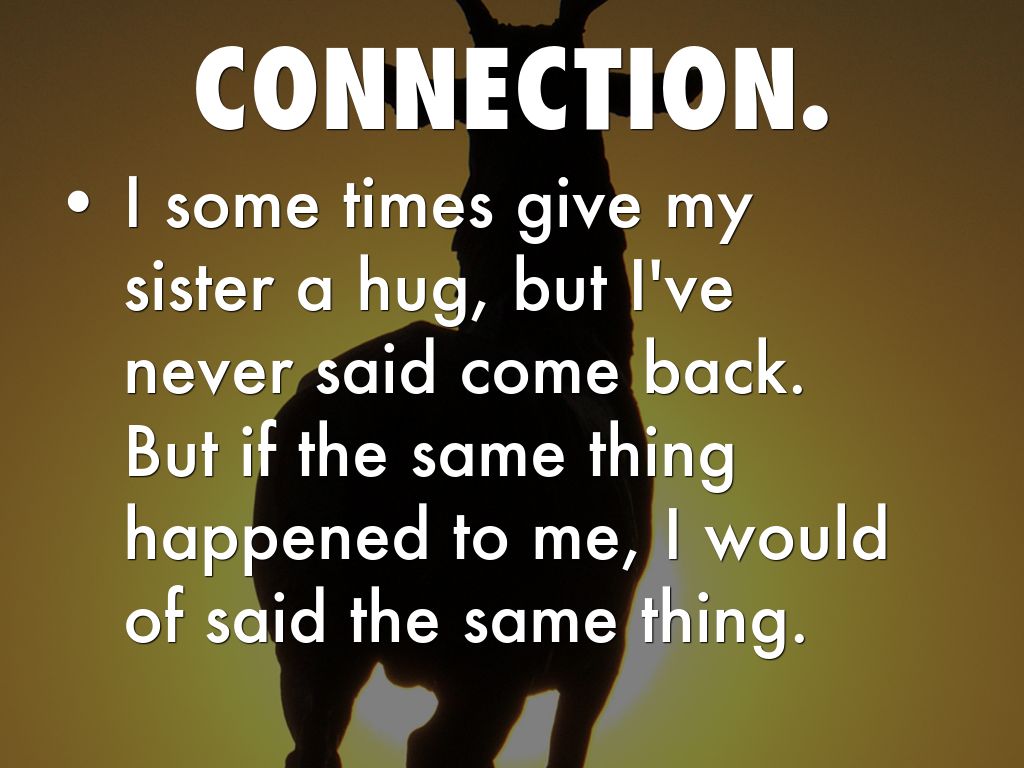 • I some times give my sister a hug, but I've never said come back. But if the same thing happened to me, I would of said the same thing.
