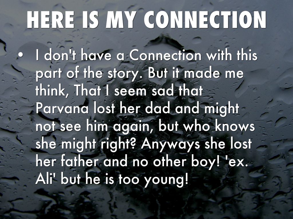 • I don't have a Connection with this part of the story. But it made me think, That I seem sad that Parvana lost her dad and might not see him again, but who knows she might right? Anyways she lost her father and no other boy! 'ex. Ali' but he is too young!