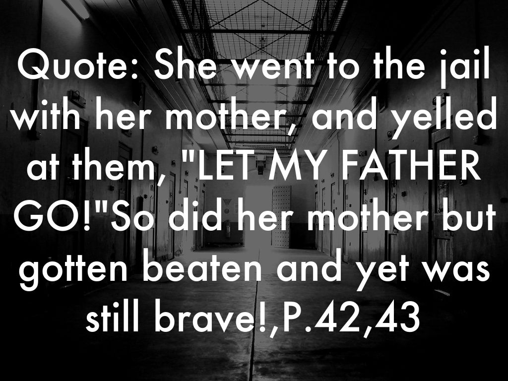 Quote: She went to the jail with her mother, and yelled at them, "LET MY FATHER GO!"So did her mother but gotten beaten and yet was still brave!,P.42,43