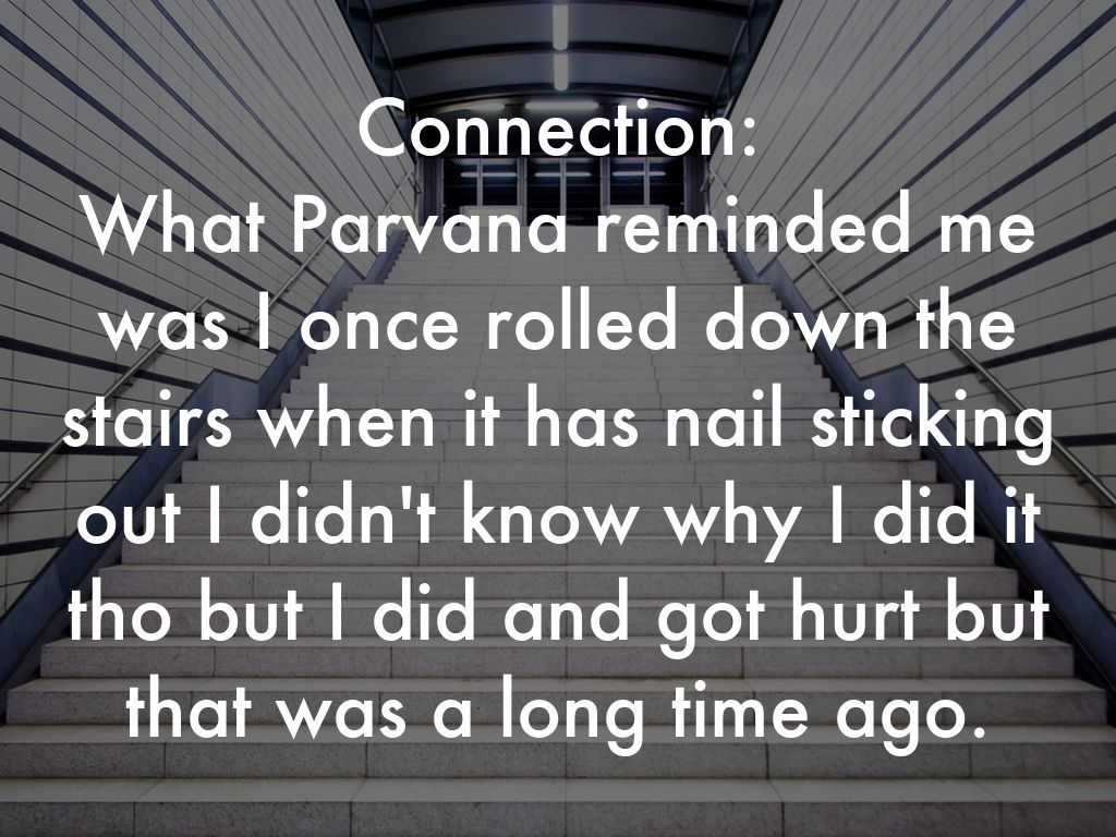 What Parvana reminded me was I once rolled down the stairs when it has nail sticking out I didn't know why I did it tho but I did and got hurt but that was a long time ago.