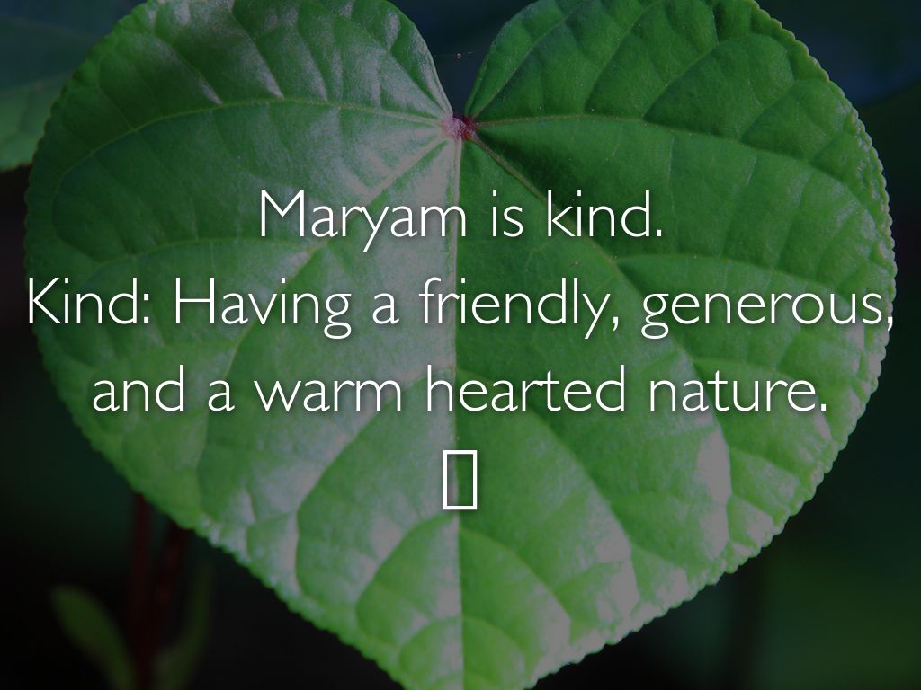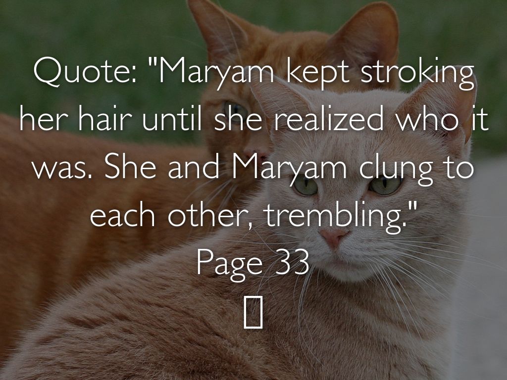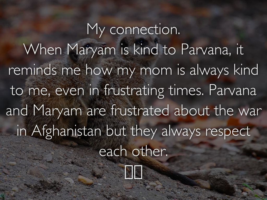 My connection. When Maryam is kind to Parvana, it reminds me how my mom is always kind to me, even in frustrating times. Parvana and Maryam are frustrated about the war in Afghanistan but they always respect each other. ππ½