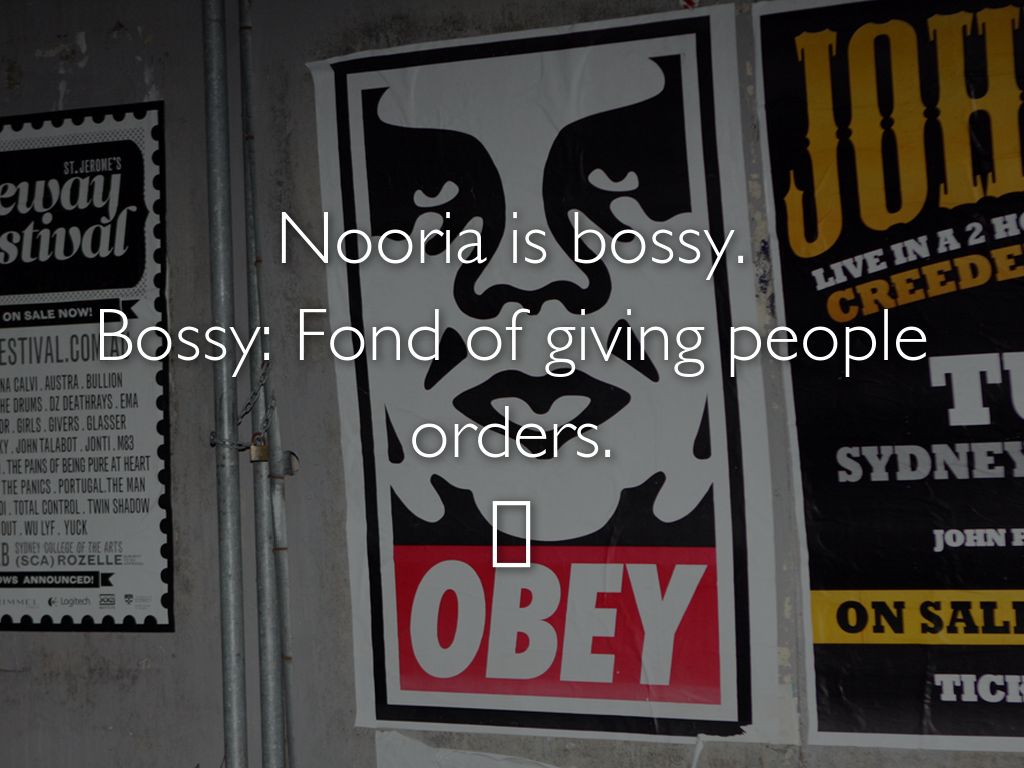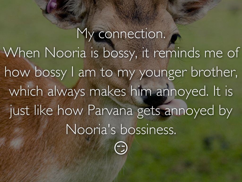 My connection. When Nooria is bossy, it reminds me of how bossy I am to my younger brother, which always makes him annoyed. It is just like how Parvana gets annoyed by Nooria's bossiness. π