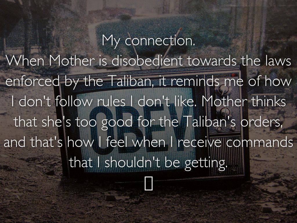 My connection. When Mother is disobedient towards the laws enforced by the Taliban, it reminds me of how I don't follow rules I don't like. Mother thinks that she's too good for the Taliban's orders, and that's how I feel when I receive commands that I shouldn't be getting. π