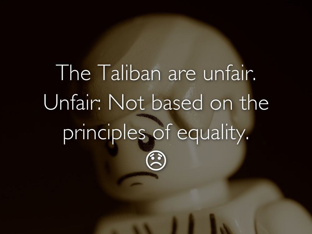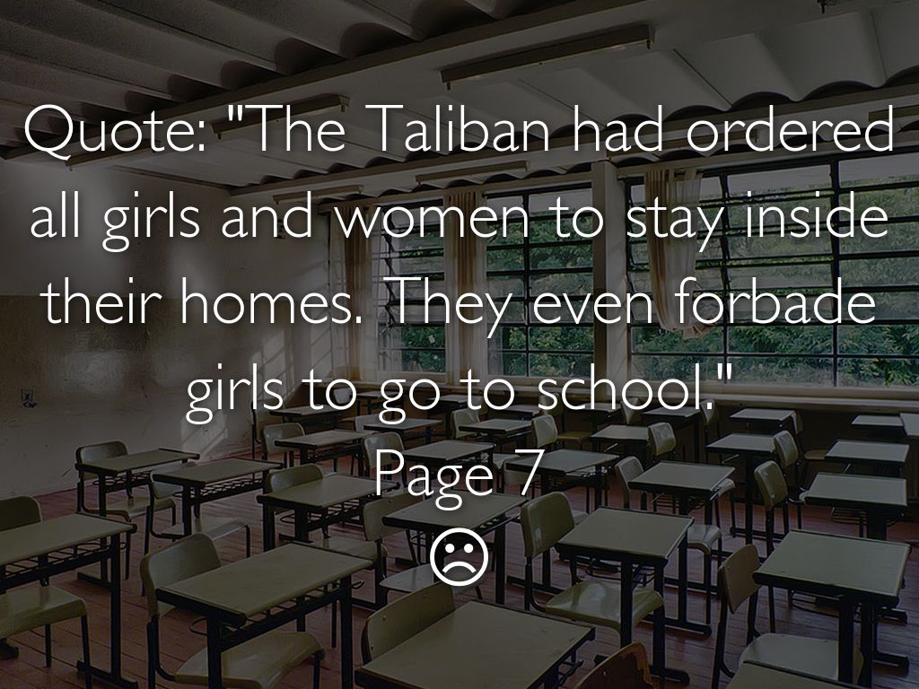 My connection. When the Taliban are so unfair all the time, it reminds me of how unfair my brother can be. He always steals and lies, but gets away with it just because of his age. My brother says he's ONLY 9, even though he's only 2 years younger than me. It really annoys me, just like how the Taliban's unfairness annoys all the females. ππ»