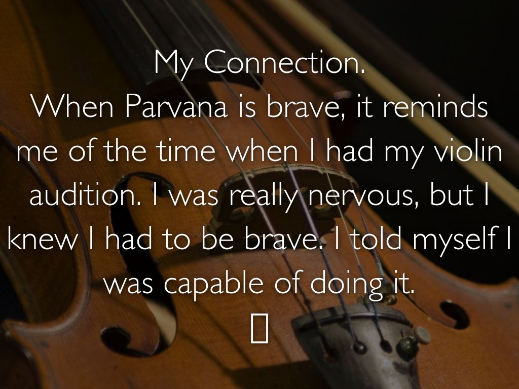 My Connection. When Parvana is brave, it reminds me of the time when I had my violin audition. I was really nervous, but I knew I had to be brave. I told myself I was capable of doing it. π»