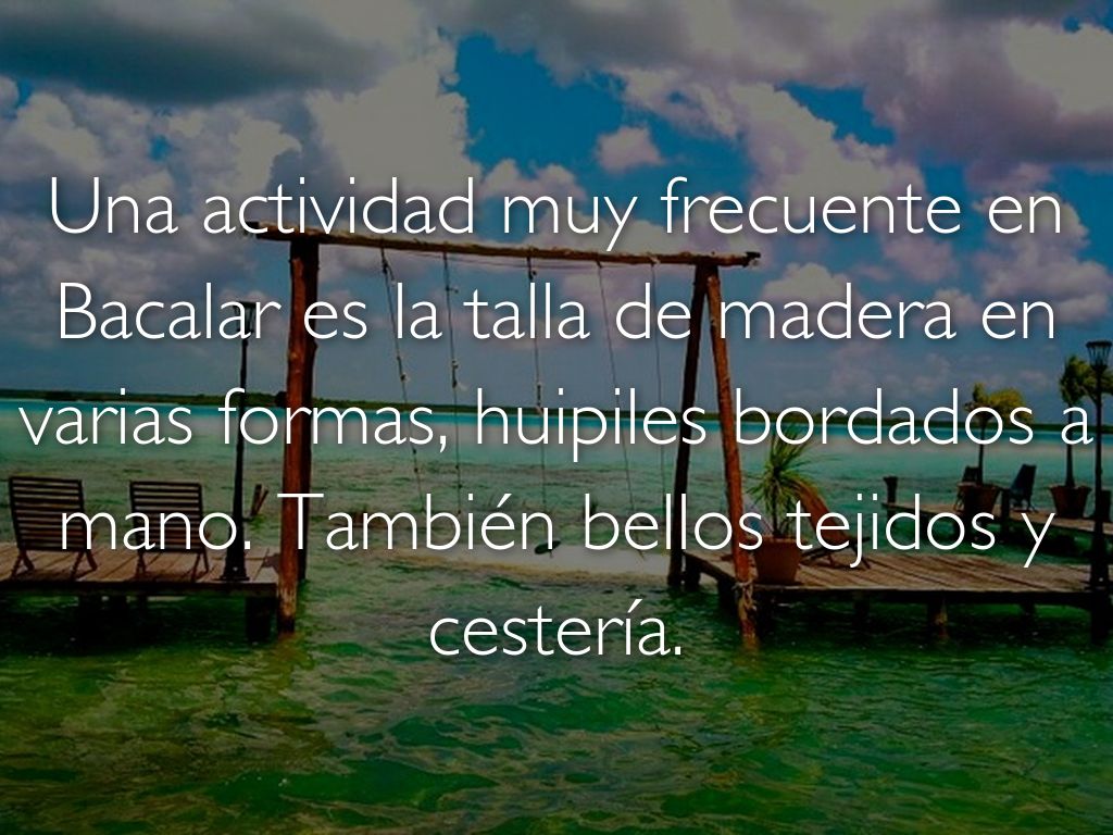Una actividad muy frecuente en Bacalar es la talla de madera en varias formas, huipiles bordados a mano. También bellos tejidos y cestería.