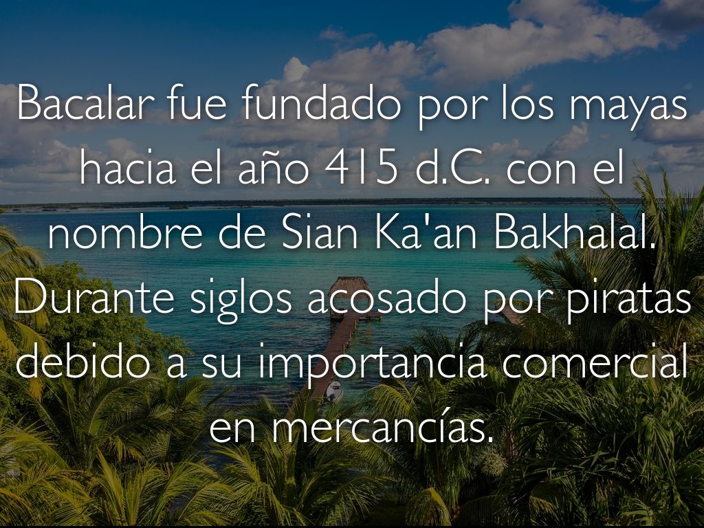 Bacalar fue fundado por los mayas hacia el año 415 d.C. con el nombre de Sian Ka'an Bakhalal. Durante siglos acosado por piratas debido a su importancia comercial en mercancías.
