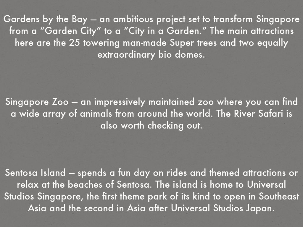 Singapore Zoo — an impressively maintained zoo where you can find a wide array of animals from around the world. The River Safari is also worth checking out.