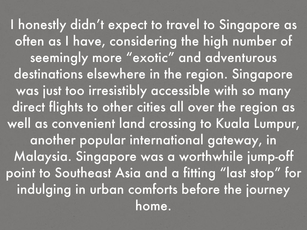 I honestly didn’t expect to travel to Singapore as often as I have, considering the high number of seemingly more “exotic” and adventurous destinations elsewhere in the region. Singapore was just too irresistibly accessible with so many direct flights to other cities all over the region as well as convenient land crossing to Kuala Lumpur, another popular international gateway, in Malaysia. Singapore was a worthwhile jump-off point to Southeast Asia and a fitting “last stop” for indulging in urban comforts before the journey home.