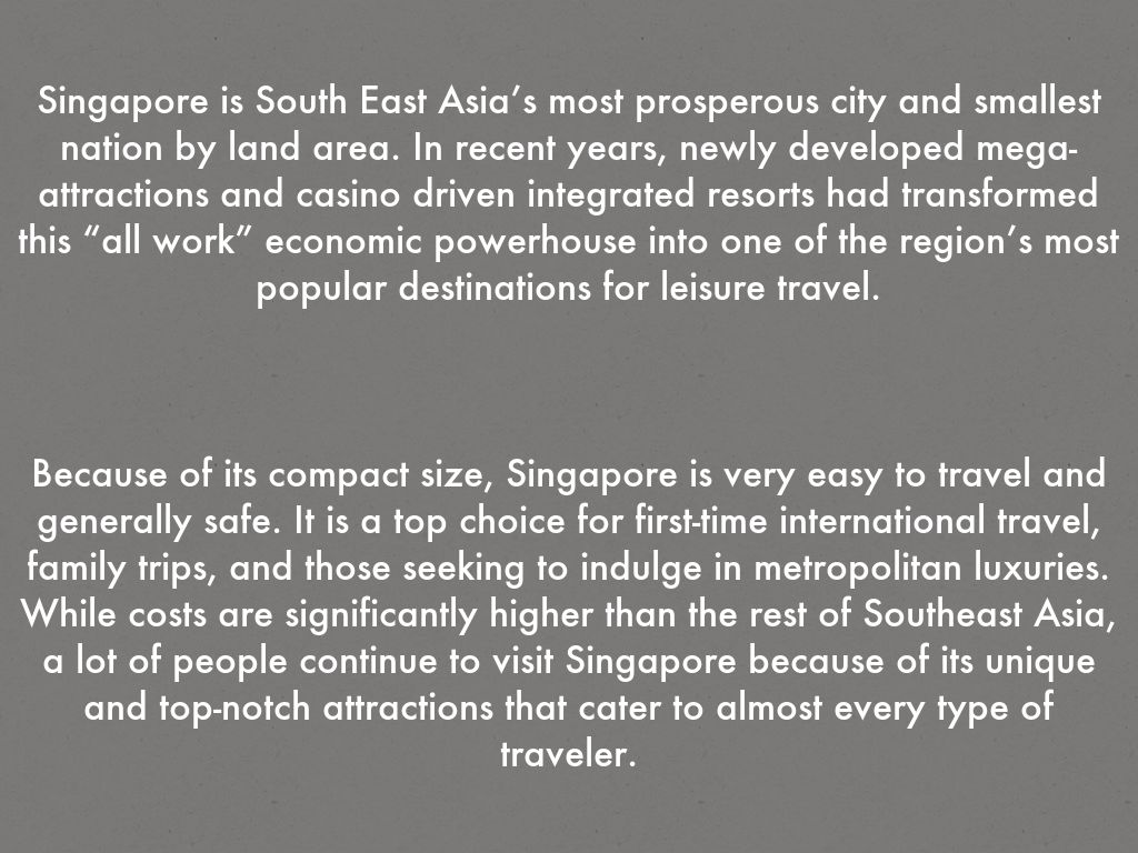 Singapore is South East Asia’s most prosperous city and smallest nation by land area. In recent years, newly developed mega-attractions and casino driven integrated resorts had transformed this “all work” economic powerhouse into one of the region’s most popular destinations for leisure travel.
