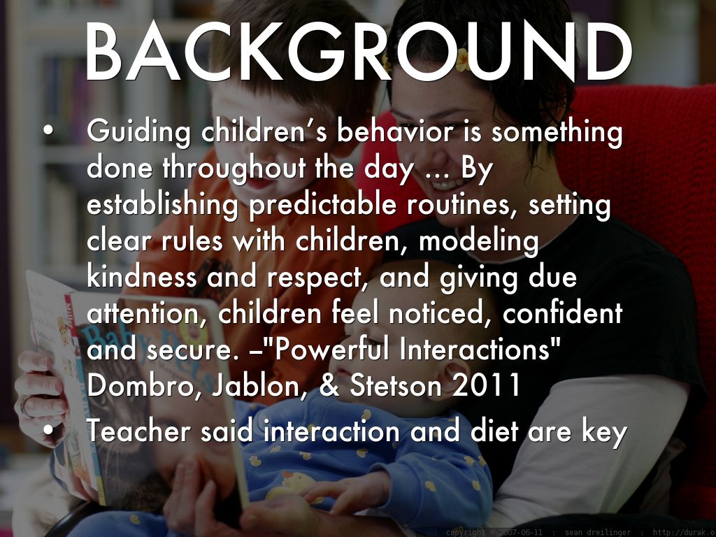 Guiding children’s behavior is something done throughout the day ... By establishing predictable routines, setting clear rules with children, modeling kindness and respect, and giving due attention, children feel noticed, confident and secure. --"Powerful Interactions" Dombro, Jablon, & Stetson 2011