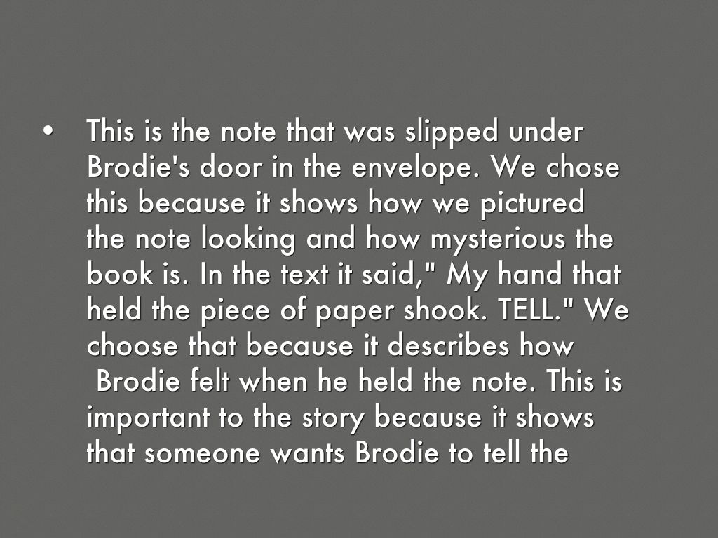 This is the note that was slipped under Brodie's door in the envelope. We chose this because it shows how we pictured the note looking and how mysterious the book is. In the text it said," My hand that held the piece of paper shook. TELL." We choose that because it describes how Brodie felt when he held the note. This is important to the story because it shows that someone wants Brodie to tell the truth.