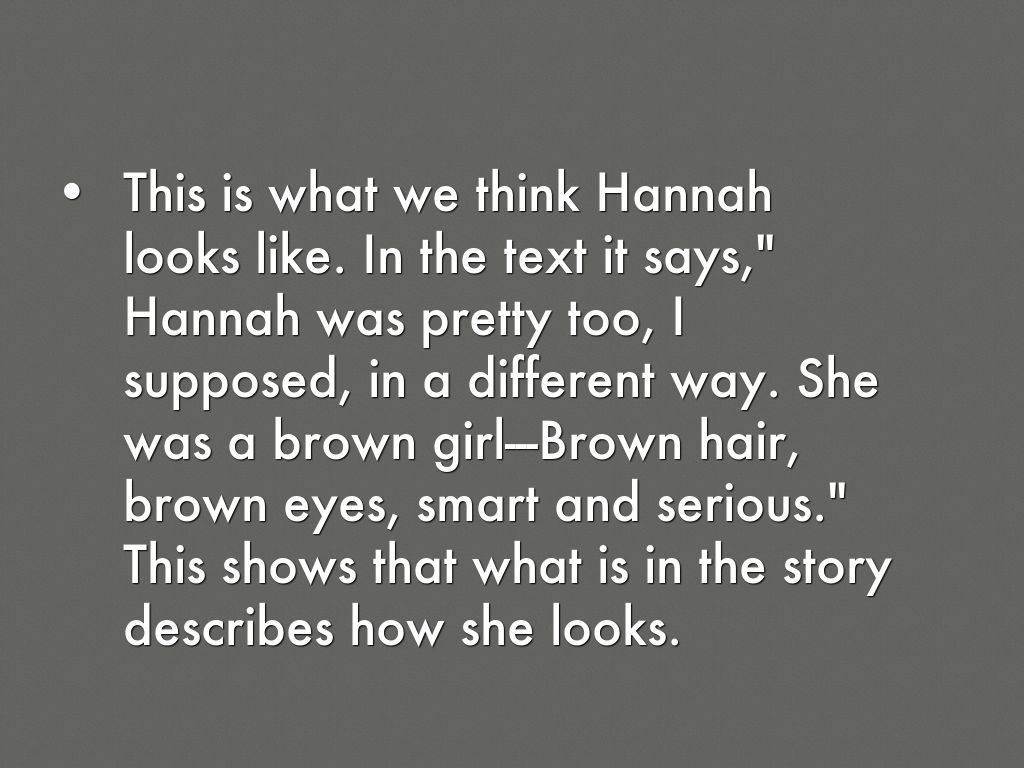 This is what we think Hannah looks like. In the text it says," Hannah was pretty too, I supposed, in a different way. She was a brown girl---Brown hair, brown eyes, smart and serious." This shows that what is in the story describes how she looks.