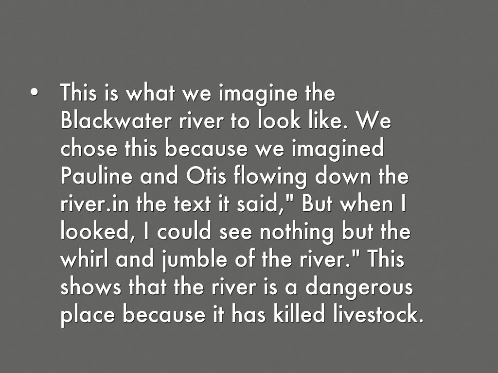 This is what we imagine the Blackwater river to look like. We chose this because we imagined Pauline and Otis flowing down the river.in the text it said," But when I looked, I could see nothing but the whirl and jumble of the river." This shows that the river is a dangerous place because it has killed livestock.