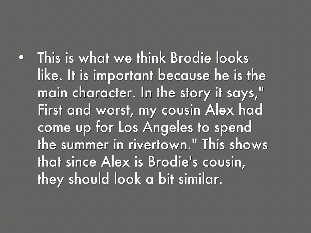 This is what we think Brodie looks like. It is important because he is the main character. In the story it says," First and worst, my cousin Alex had come up for Los Angeles to spend the summer in rivertown." This shows that since Alex is Brodie's cousin, they should look a bit similar.