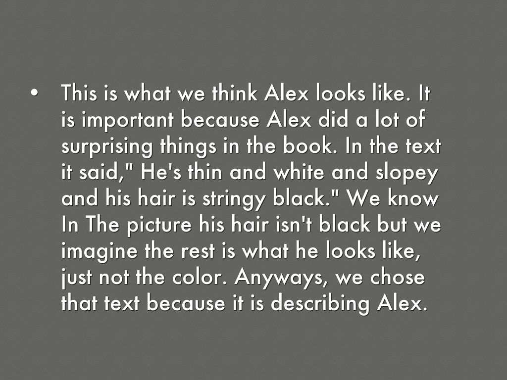 This is what we think Alex looks like. It is important because Alex did a lot of surprising things in the book. In the text it said," He's thin and white and slopey and his hair is stringy black." We know In The picture his hair isn't black but we imagine the rest is what he looks like, just not the color. Anyways, we chose that text because it is describing Alex.