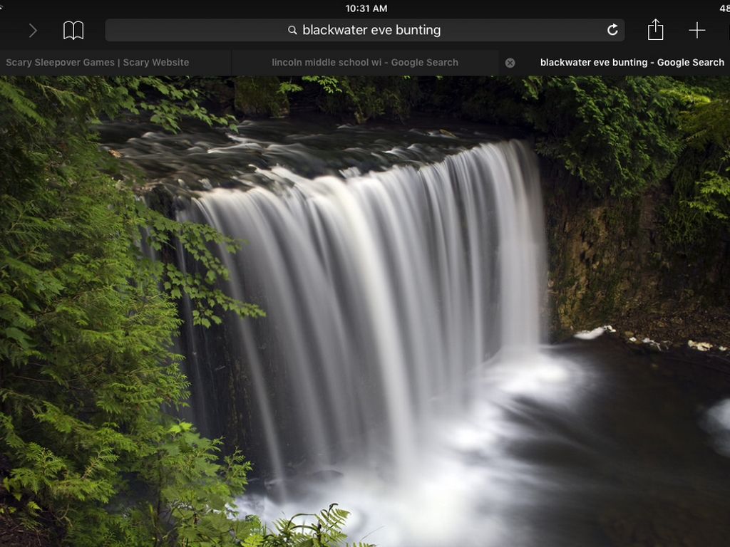 We chose to put this in the presentation because this is what we picture the Blackwater falls to look like. This is important to the story because it helps you picture what the setting would be like because they are by the Blackwater a lot. In the text it states,"Blackwater falls is about seven miles downriver. You don't want to go swimming near them." This shows that it's near the pond so they talked about it.