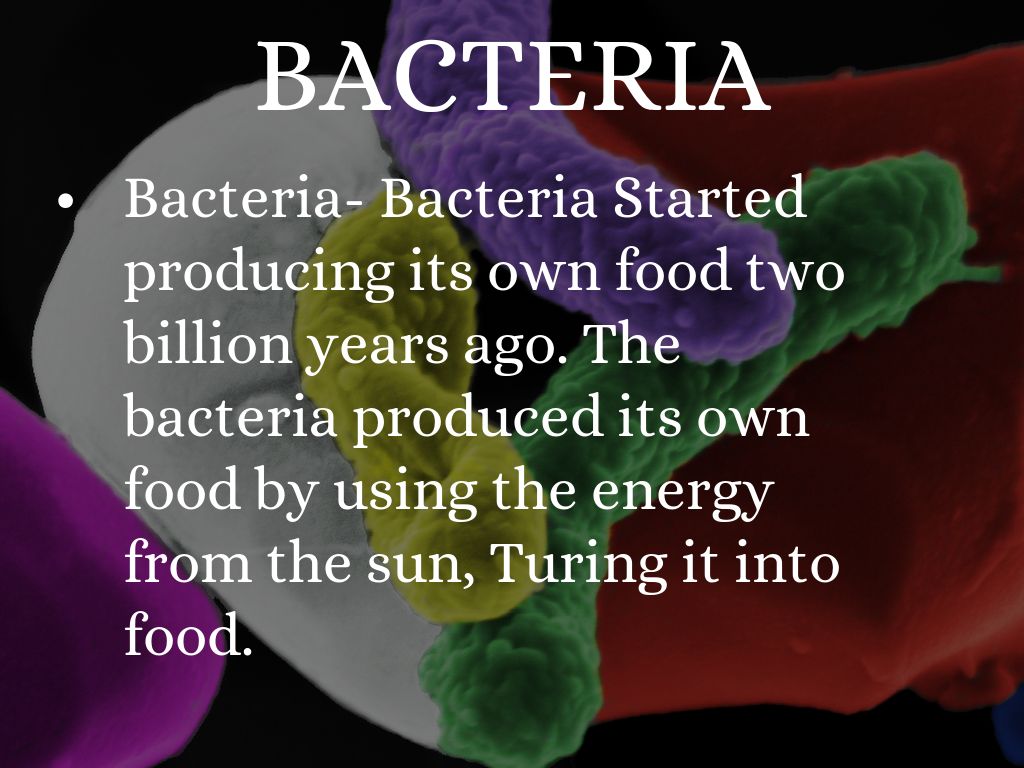 • Bacteria- Bacteria Started producing its own food two billion years ago. The bacteria produced its own food by using the energy from the sun, Turing it into food.