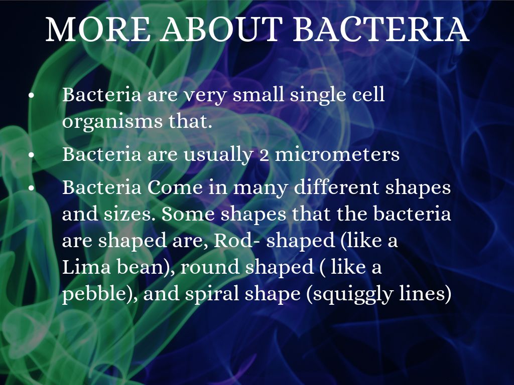 • Bacteria Come in many different shapes and sizes. Some shapes that the bacteria are shaped are, Rod- shaped (like a Lima bean), round shaped ( like a pebble), and spiral shape (squiggly lines)