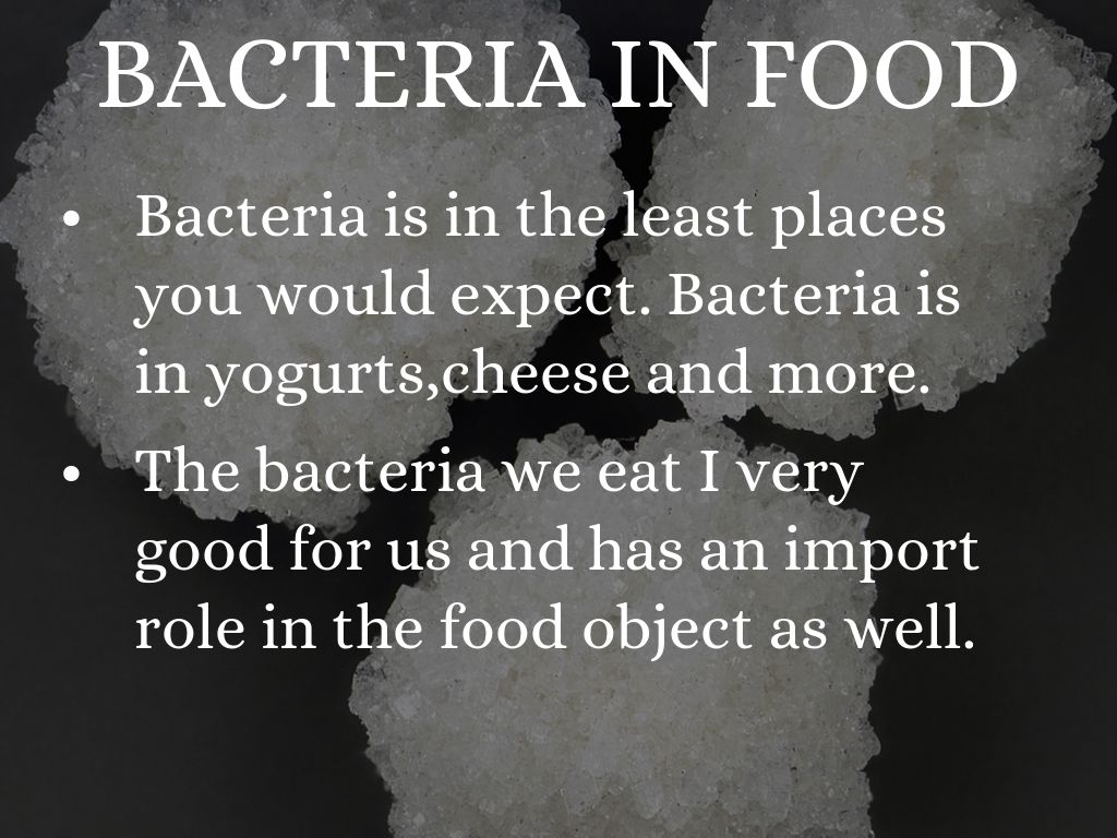 • Bacteria is in the least places you would expect. Bacteria is in yogurts,cheese and more.
