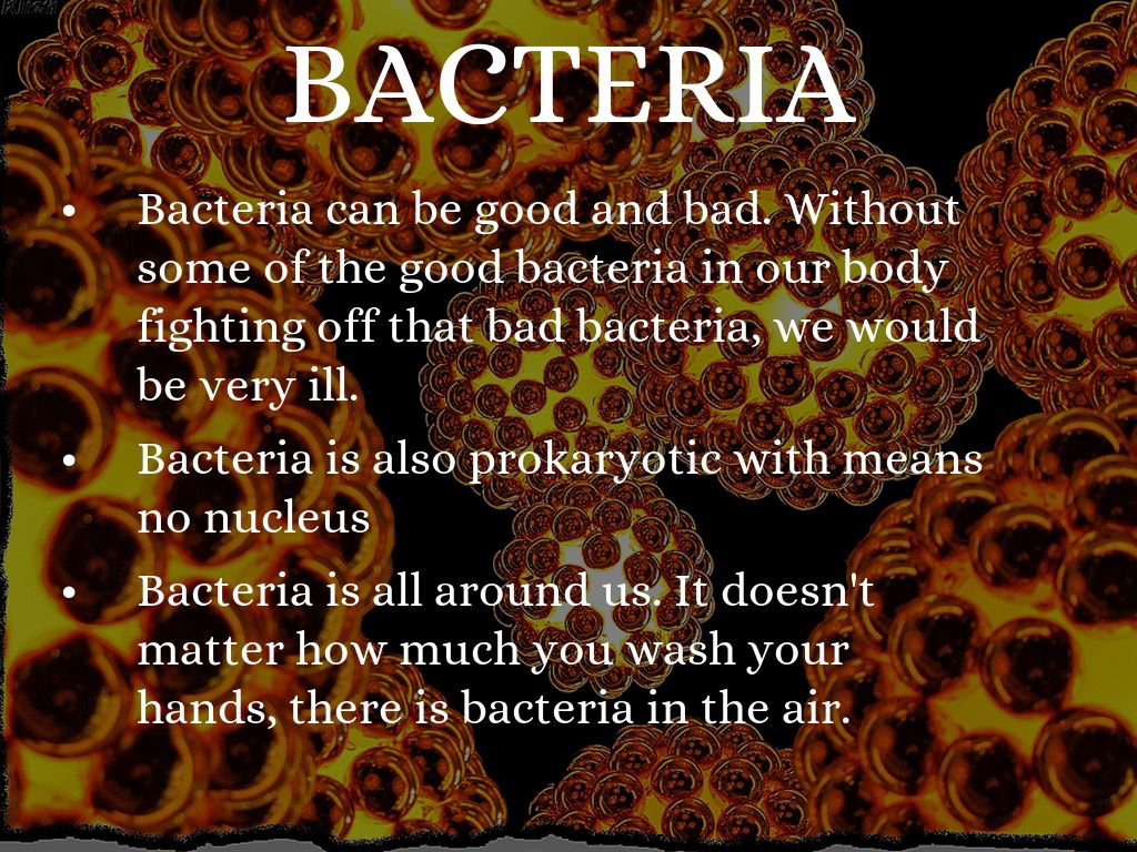 • Bacteria can be good and bad. Without some of the good bacteria in our body fighting off that bad bacteria, we would be very ill.