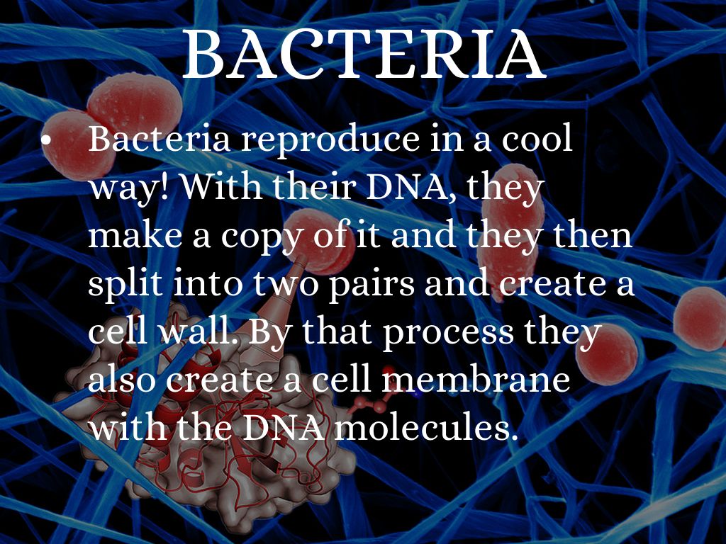 • Bacteria reproduce in a cool way! With their DNA, they make a copy of it and they then split into two pairs and create a cell wall. By that process they also create a cell membrane with the DNA molecules.