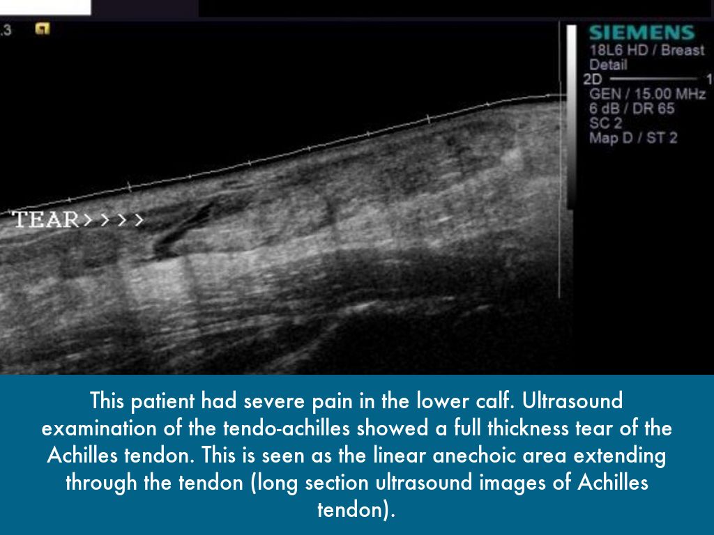 This patient had severe pain in the lower calf. Ultrasound examination of the tendo-achilles showed a full thickness tear of the Achilles tendon. This is seen as the linear anechoic area extending through the tendon (long section ultrasound images of Achilles tendon).