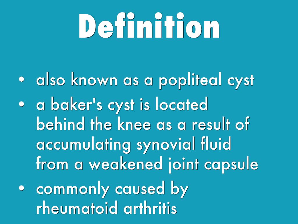 • a baker's cyst is located behind the knee as a result of accumulating synovial fluid from a weakened joint capsule