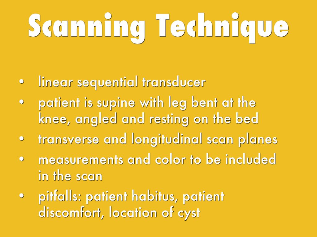 • pitfalls: patient habitus, patient discomfort, location of cyst