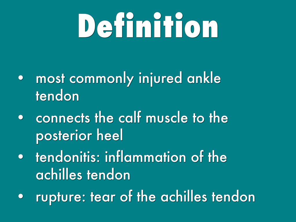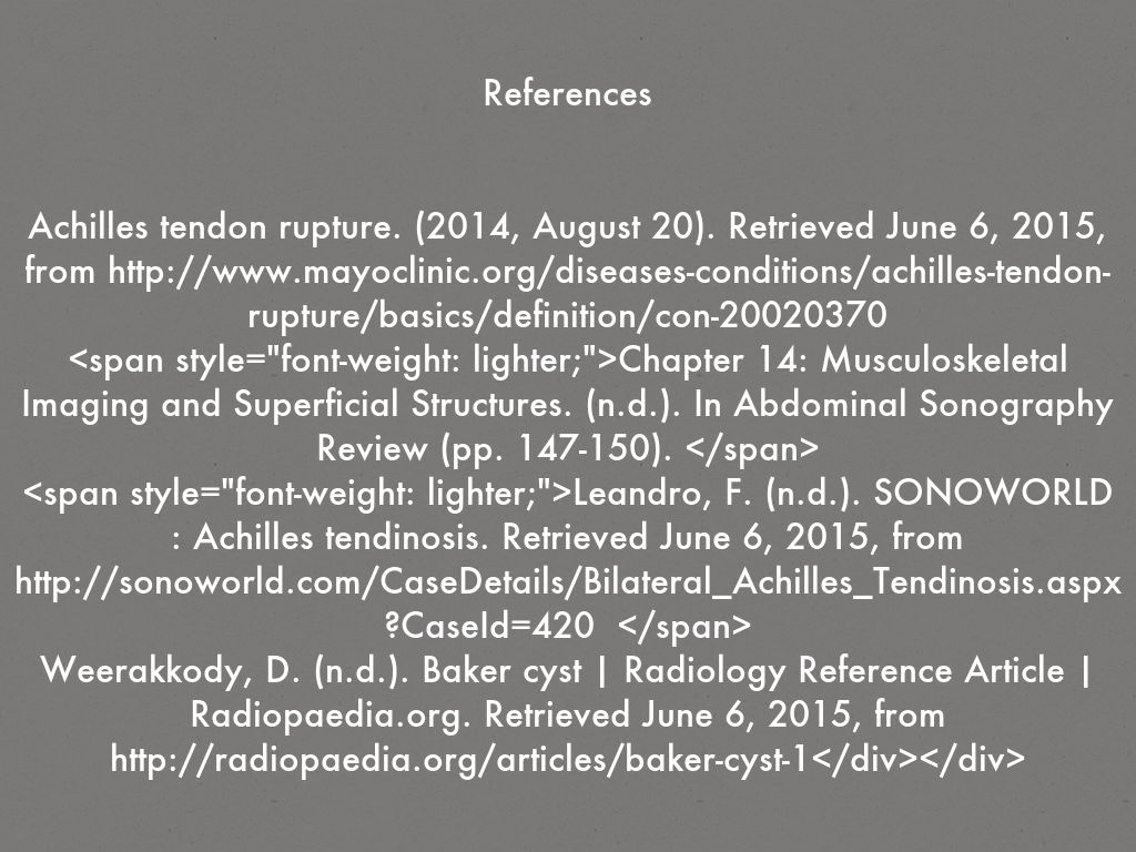 Achilles tendon rupture. (2014, August 20). Retrieved June 6, 2015, from http://www.mayoclinic.org/diseases-conditions/achilles-tendon-rupture/basic...