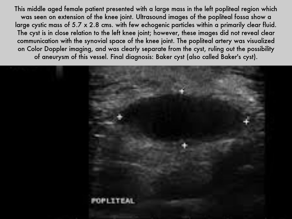 This middle aged female patient presented with a large mass in the left popliteal region which was seen on extension of the knee joint. Ultrasound images of the popliteal fossa show a large cystic mass of 5.7 x 2.8 cms. with few echogenic particles within a primarily clear fluid. The cyst is in close relation to the left knee joint; however, these images did not reveal clear communication with the synovial space of the knee joint. The popliteal artery was visualized on Color Doppler imaging, and was clearly separate from the cyst, ruling out the possibility of aneurysm of this vessel. Final diagnosis: Baker cyst (also called Baker's cyst).