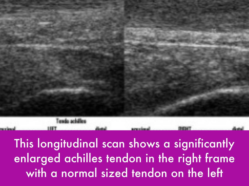 This longitudinal scan shows a significantly enlarged achilles tendon in the right frame with a normal sized tendon on the left