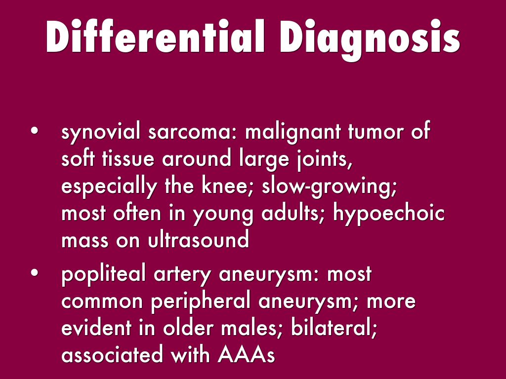 • synovial sarcoma: malignant tumor of soft tissue around large joints, especially the knee; slow-growing; most often in young adults; hypoechoic mass on ultrasound