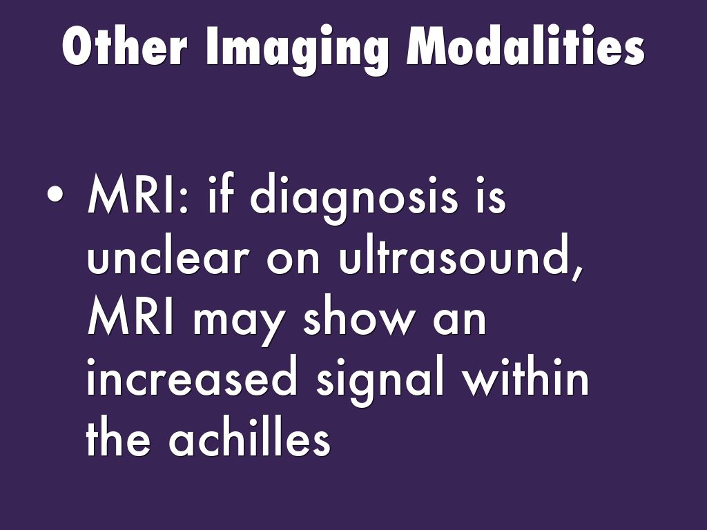 • MRI: if diagnosis is unclear on ultrasound, MRI may show an increased signal within the achilles