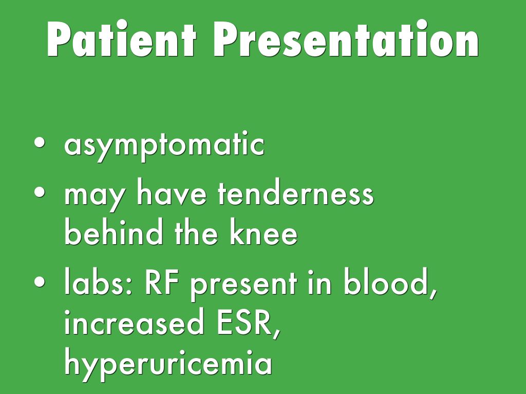• labs: RF present in blood, increased ESR, hyperuricemia