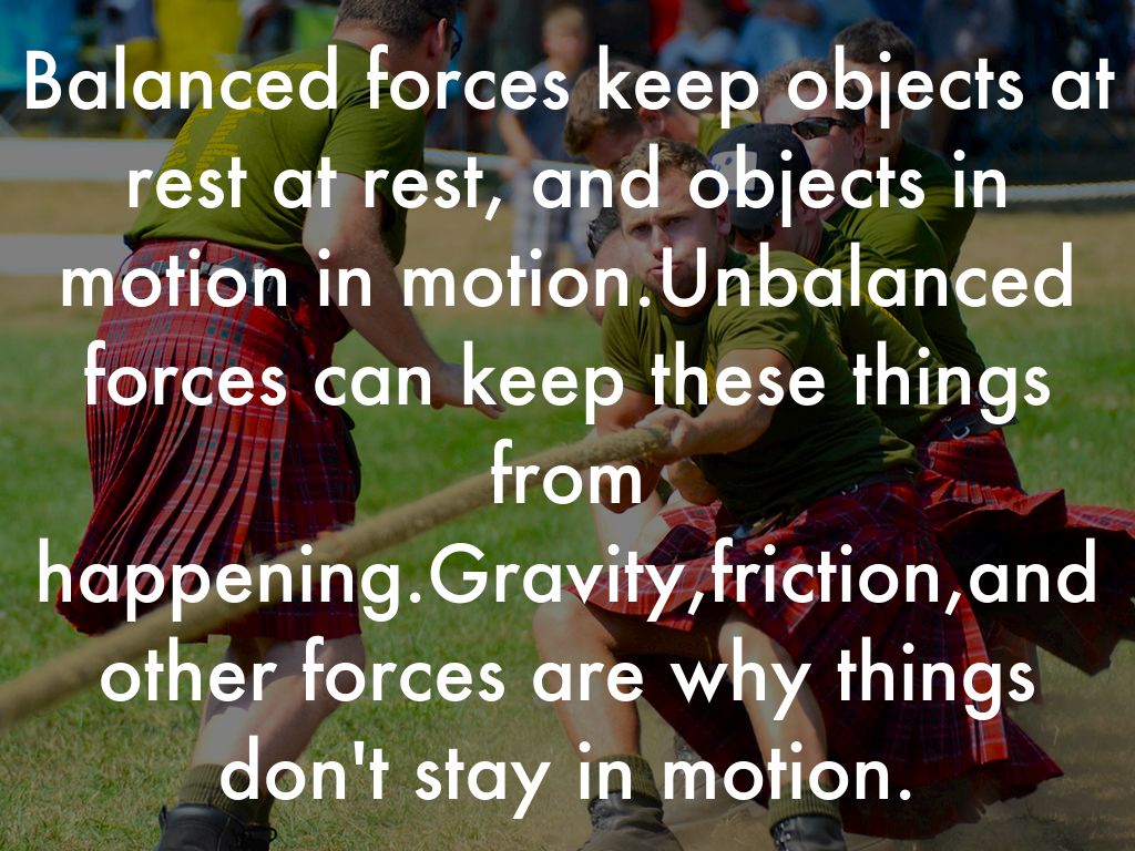 Balanced forces keep objects at rest at rest, and objects in motion in motion.Unbalanced forces can keep these things from happening.Gravity,friction,and other forces are why things don't stay in motion.