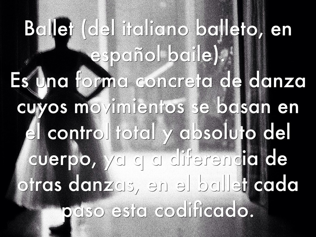 Ballet (del italiano balleto, en español baile). Es una forma concreta de danza cuyos movimientos se basan en el control total y absoluto del cuerpo, ya q a diferencia de otras danzas, en el ballet cada paso esta codificado.