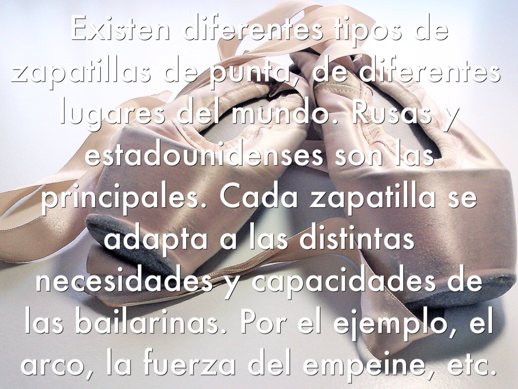 Existen diferentes tipos de zapatillas de punta, de diferentes lugares del mundo. Rusas y estadounidenses son las principales. Cada zapatilla se adapta a las distintas necesidades y capacidades de las bailarinas. Por el ejemplo, el arco, la fuerza del empeine, etc.