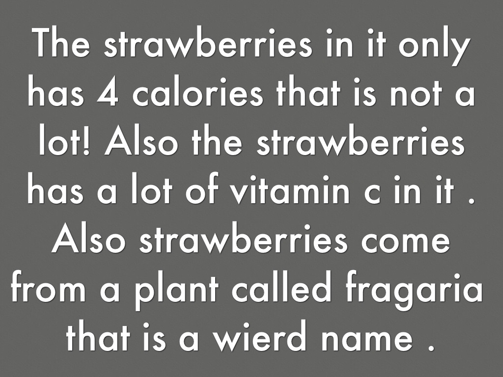 The strawberries in it only has 4 calories that is not a lot! Also the strawberries has a lot of vitamin c in it . Also strawberries come from a plant called fragaria that is a wierd name .