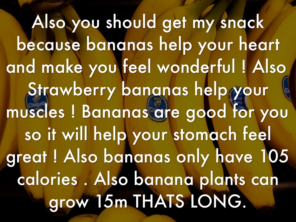Also you should get my snack because bananas help your heart and make you feel wonderful ! Also Strawberry bananas help your muscles ! Bananas are good for you so it will help your stomach feel great ! Also bananas only have 105 calories . Also banana plants can grow 15m THATS LONG.