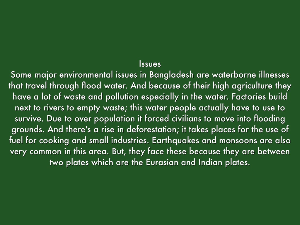 Some major environmental issues in Bangladesh are waterborne illnesses that travel through flood water. And because of their high agriculture they have a lot of waste and pollution especially in the water. Factories build next to rivers to empty waste; this water people actually have to use to survive. Due to over population it forced civilians to move into flooding grounds. And there's a rise in deforestation; it takes places for the use of fuel for cooking and small industries. Earthquakes and monsoons are also very common in this area. But, they face these because they are between two plates which are the Eurasian and Indian plates.