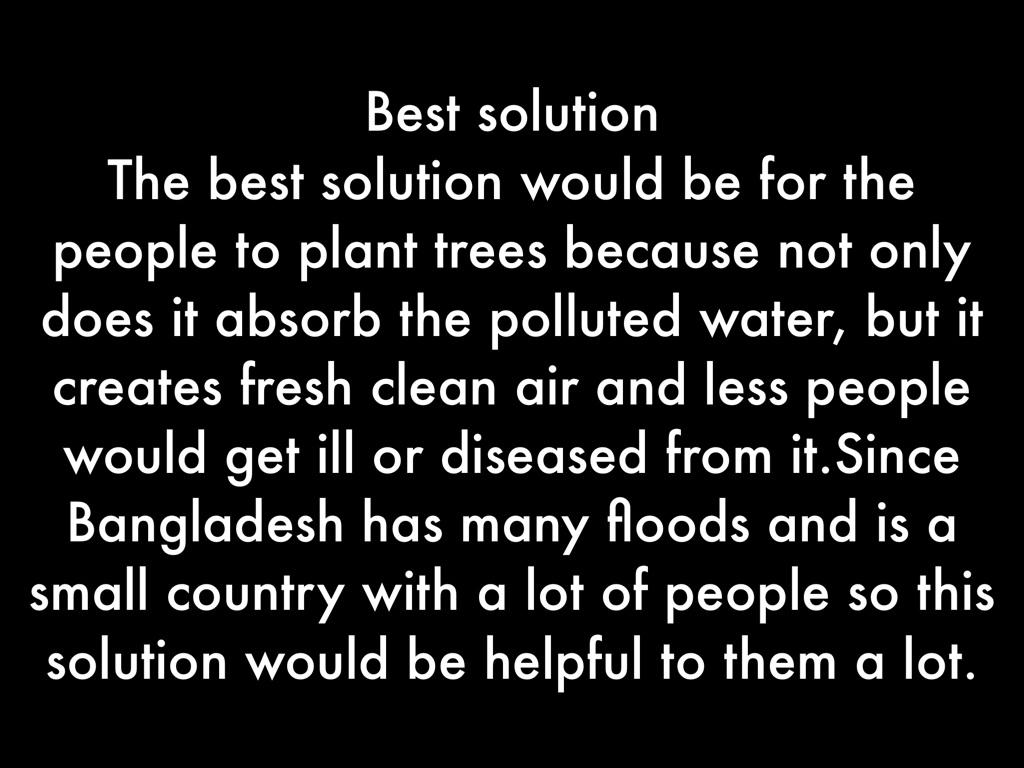 The best solution would be for the people to plant trees because not only does it absorb the polluted water, but it creates fresh clean air and less people would get ill or diseased from it.Since Bangladesh has many floods and is a small country with a lot of people so this solution would be helpful to them a lot.