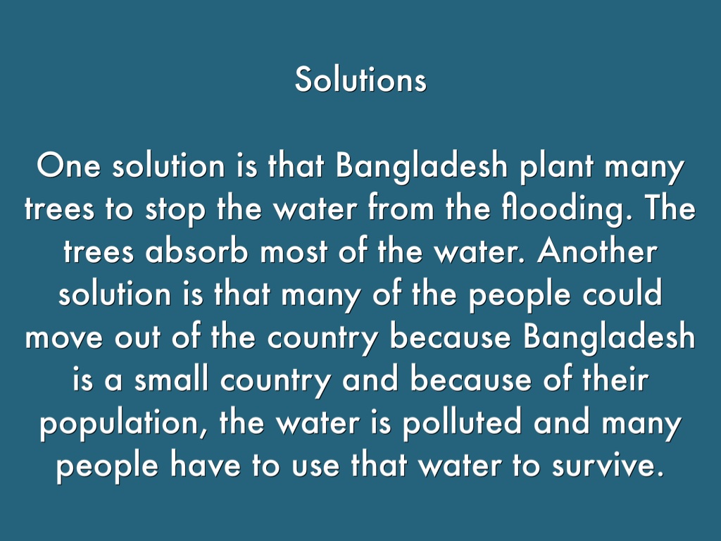 One solution is that Bangladesh plant many trees to stop the water from the flooding. The trees absorb most of the water. Another solution is that many of the people could move out of the country because Bangladesh is a small country and because of their population, the water is polluted and many people have to use that water to survive.