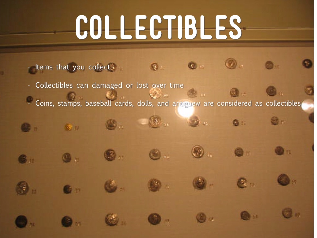 • Coins, stamps, baseball cards, dolls, and antiguew are considered as collectibles