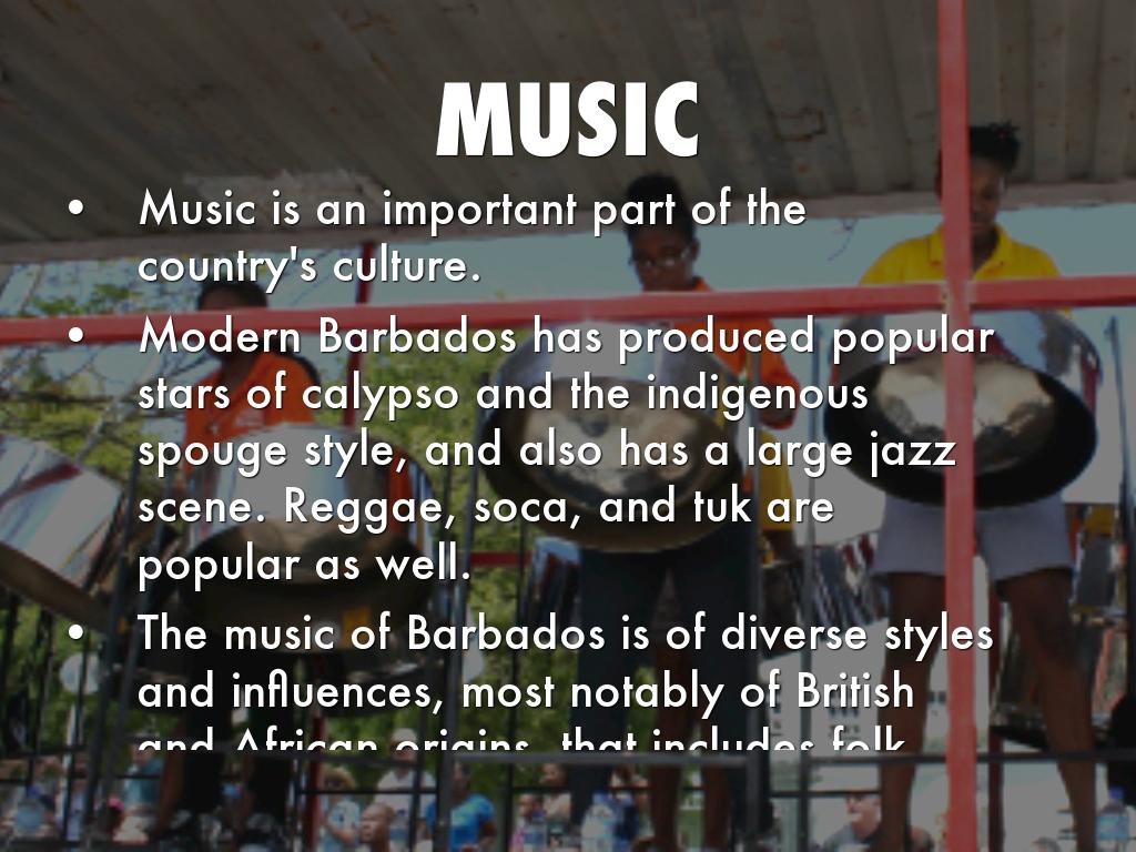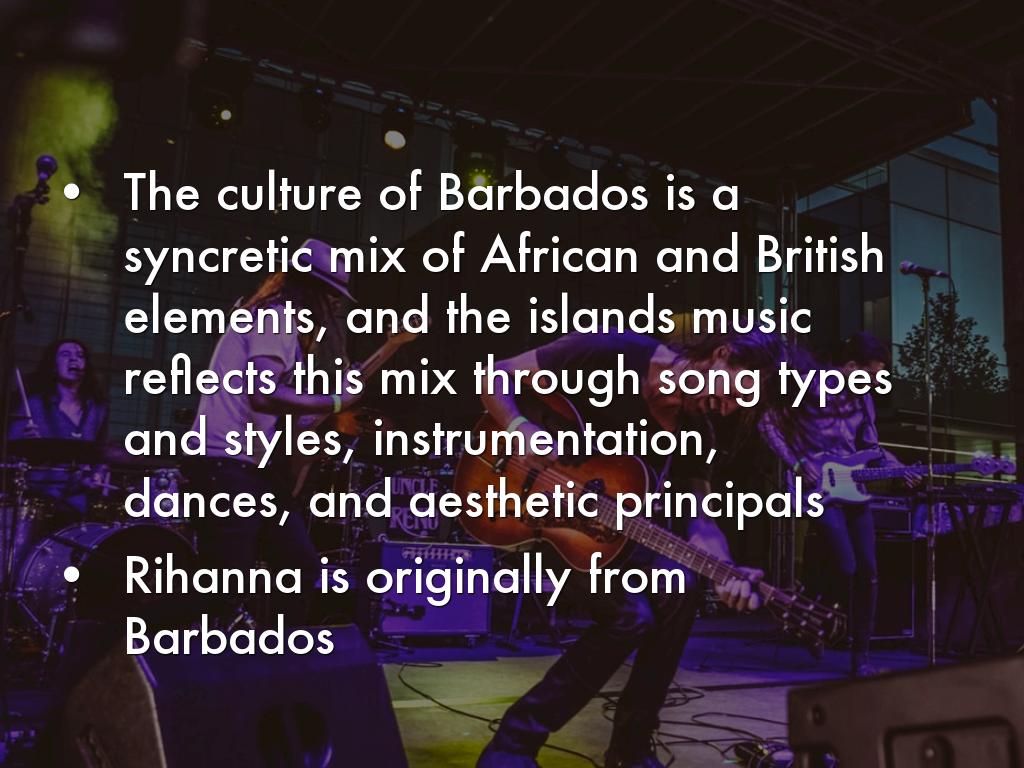 The culture of Barbados is a syncretic mix of African and British elements, and the islands music reflects this mix through song types and styles, instrumentation, dances, and aesthetic principals