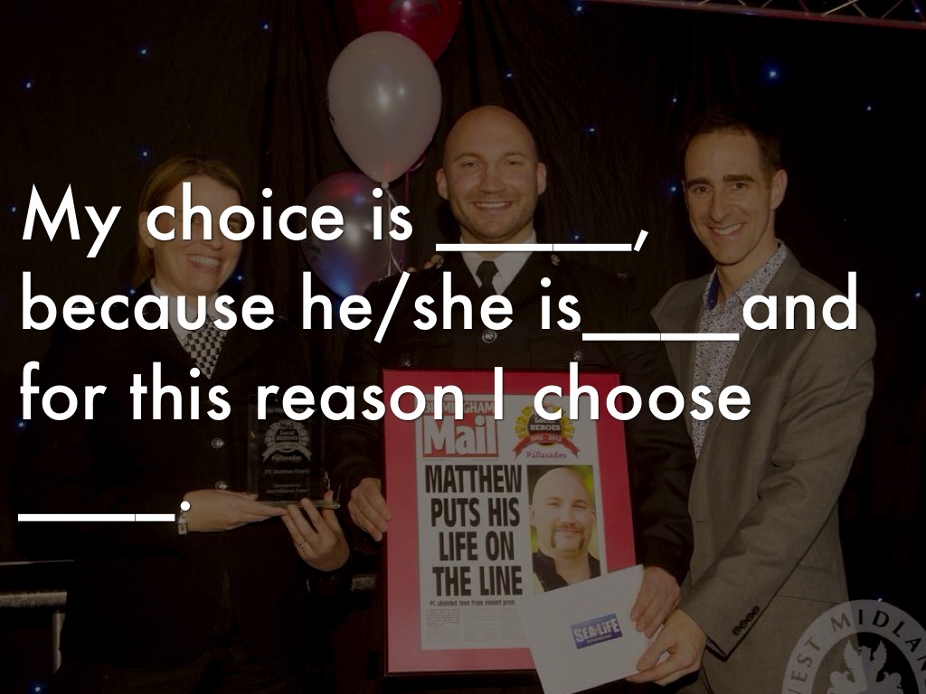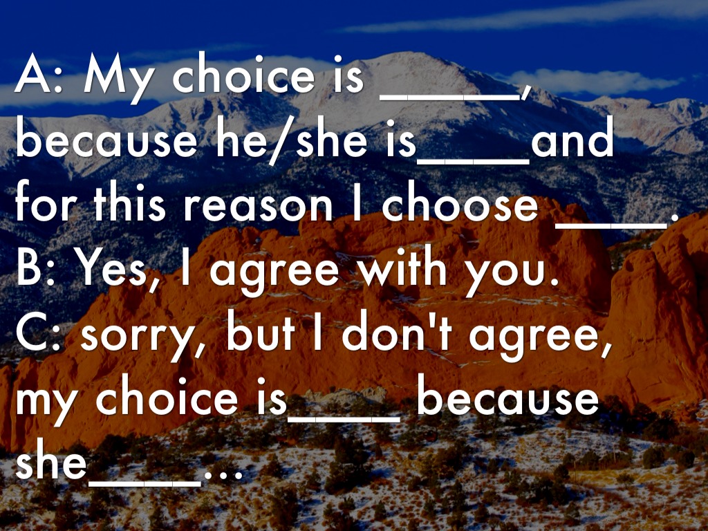A: My choice is _____, because he/she is____and for this reason I choose ____. B: Yes, I agree with you. C: sorry, but I don't agree, my choice is____ because she____...