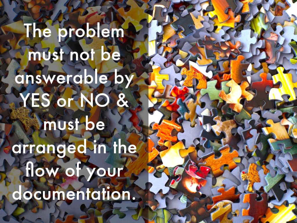 The problem must not be answerable by YES or NO & must be arranged in the flow of your documentation.