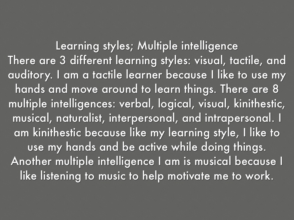 There are 3 different learning styles: visual, tactile, and auditory. I am a tactile learner because I like to use my hands and move around to learn things. There are 8 multiple intelligences: verbal, logical, visual, kinithestic, musical, naturalist, interpersonal, and intrapersonal. I am kinithestic because like my learning style, I like to use my hands and be active while doing things. Another multiple intelligence I am is musical because I like listening to music to help motivate me to work.